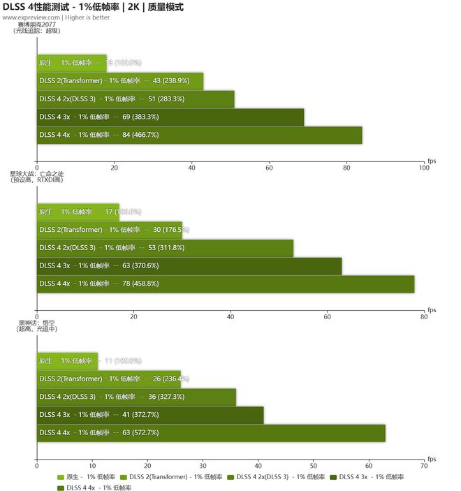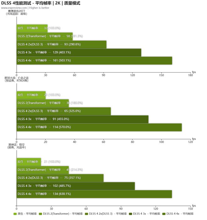 既然2K原生分辨率遊戲對於顯存要求很高,那麼DLSS 4技術對RTX 5060 Ti 8G星際就相當有用了,畢竟降低渲染分辨率之後,顯存的需求也會隨之下降,避免了顯存需求過大的問題。這裏的DLSS 4測試依舊選擇2K分辨率+質量擋的設定,保證超分後的畫面不會明顯模糊。參與測試的遊戲有《賽博朋克2077》和《星球大戰:亡命之徒》,以及最近全平臺更新支持DLSS 4的《黑神話:悟空》,看看開啓DLSS 4之後,星際 RTX 5060 Ti 8G能否暢玩2K光追遊戲。