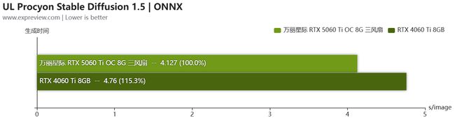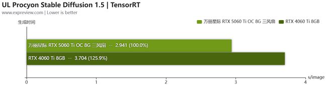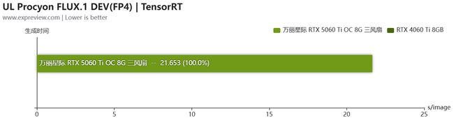 在生成圖片測試中,Stable Diffusion 1.5的兩個項目都是星際 RTX 5060 Ti 8G領先,其中TensorRT項目領先幅度大一些,生成時間比RTX 4060 Ti 8G快了四分之一。而到了FLUX.1(FP4)測試中,RTX 4060 Ti 8G直接報錯無法完成,星際 RTX 5060 Ti 8G則順利完成了生圖任務,看來Blackwell架構的特殊優化還是相當有用的。
