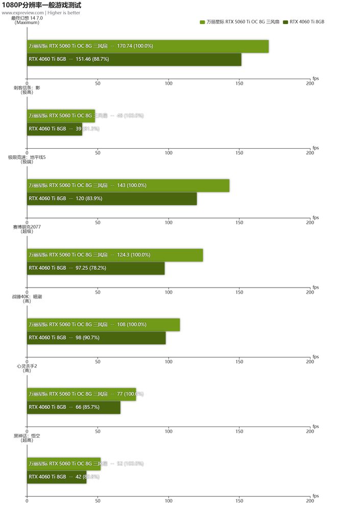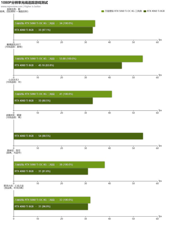 1080P分辨率下的情況和2K有所不同,星際 RTX 5060 Ti 8G依舊保持對RTX 4060 Ti 8G的全面領先,而且由於顯存需求下降,光柵測試中沒有了像2K測試那樣拉不開差距的問題,開啓光追後則依舊有類似情況。如果算平均領先幅度的話,1080P光柵測試中星際 RTX 5060 Ti 8G領先RTX 4060 Ti 8G 19.1%,而光追測試則領先14.2%,領先幅度比2K分辨率有所上升。