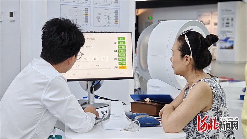 6月18日,第二屆雄安未來之城場景匯未來城市場景體驗周展廳內,參觀者現場體驗中醫AI輔助診斷設備「望聞問切」。河北日報記者 曹錚 攝