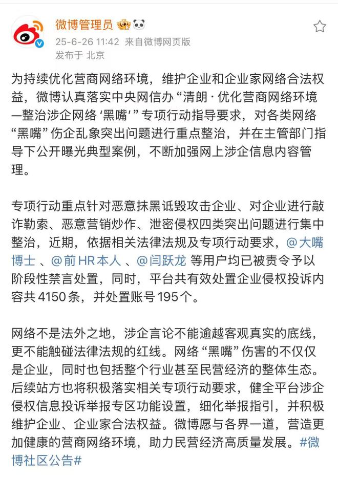 微博管理員今日發文稱,為持續優化營商網絡環境,維護企業和企業家網絡合法權益,微博認真落實中央網信辦「清朗·優化營商網絡環境—整治涉企網絡‘黑嘴’」專項行動指導要求,對各類網絡「黑嘴」傷企亂象突出問題進行重點整治,並在主管部門指導下公開曝光典型案例,不斷加強網上涉企信息內容管理。