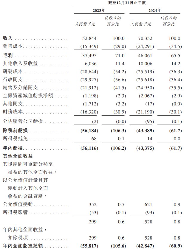 財務方面,於2023年度、2024年度,德適生物實現收入分別約為5284.4萬元、7035.2萬元人民幣;同期年內虧損分別為5611.6萬元、4337.5萬元人民幣。