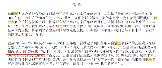 公司營業收入主要來自集成式域控解決方案銷售,客戶集中在主機廠。2022-2024年,前五名客戶營業收入總額分別佔營收總額92.8%、91.2%及84.7%,最大客戶分別佔52.8%、53.0%及22.8%。客戶集中度呈下降趨勢,但對大客戶依賴仍較高,若大客戶採購變化,將對營收產生較大影響。