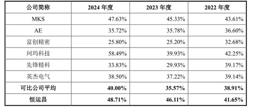 招股書顯示,2022年-2024年,恆運昌主營業務毛利率分別爲41.65%、46.11%和 48.71%,連續三年不斷提升。對比看,同期包括MKS、AE在內的可比上市公司平均毛利率分別爲38.91%、35.57%和40%,整體表現較爲平穩。其中,樂衛平老東家AE的銷售毛利率分別爲36.6%、35.78%和35.72%,連續三年同比下滑。