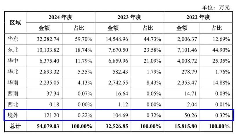 數據顯示,2022年-2024年,恆運昌實現境外收入分別爲50.26萬元、104.69萬元和121.2萬元,收入佔比均不足0.5%,海外市場開拓進展極其緩慢。