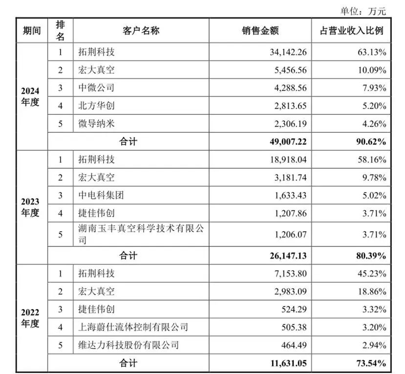財務數據顯示,2022年-2024年,恆運昌實現營業收入分別爲1.58億元、3.25億元和5.41億元,實現淨利潤分別爲2638.97萬元、8053.58萬元和1.43億元,業績保持較快增長。其中,公司向第一 大客戶拓荊科技銷售收入分別爲 7153.80 萬元、18918.04 萬元 及 34142.26 萬元,佔營業收入的比重分別爲 45.23%、58.16%及 63.13%,連續兩年收入佔比超過50%且持續提升。