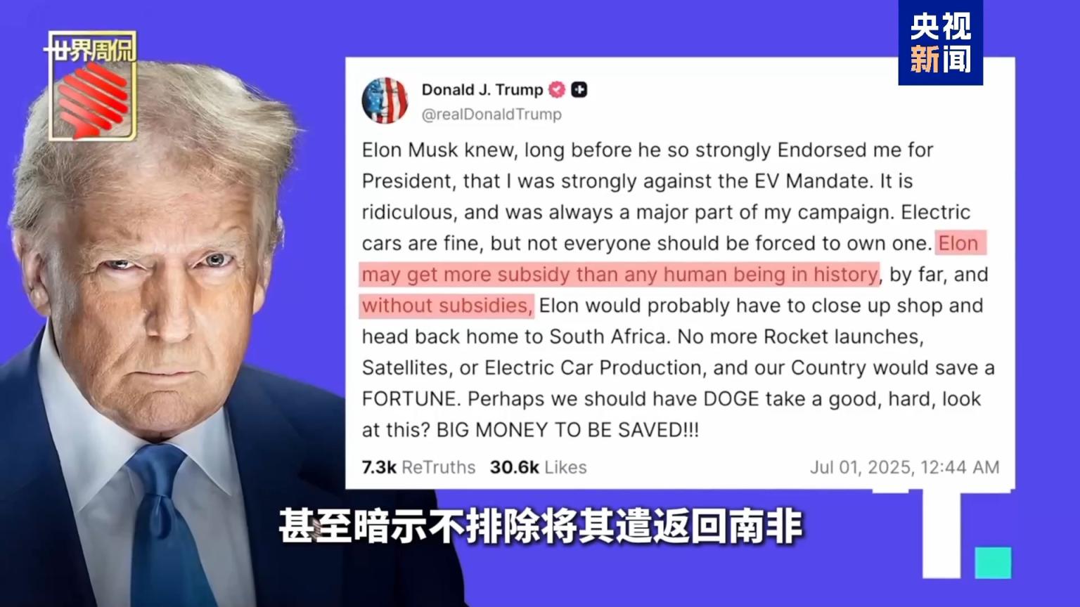 而特朗普則在「真相社交」上回懟稱馬斯克「是靠聯邦補貼起家的吸血鬼」,甚至暗示不排除將其「遣返回南非」。
