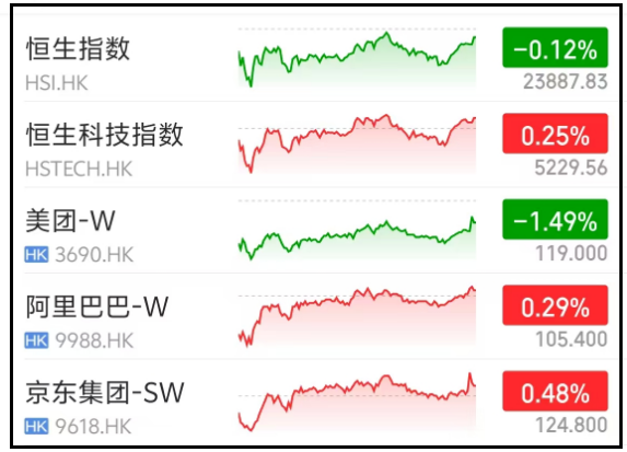 但是,市場確實是韌性十足,下圖,可以看到三隻個股,和兩大指數的日內走勢圖,上午和下午,分別有過一波拉升,最後只剩美團跌了1.5%——因此,這個周末的外賣大戰,暫時由美團的股東買單。