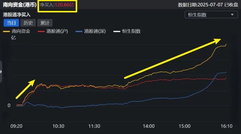 而拉升的邏輯,還是資金驅動——南下的資金,選擇了堅定的抄底,下圖,兩次加速買入的過程(黃線),和上圖的日內K線的形態,也是吻合的。