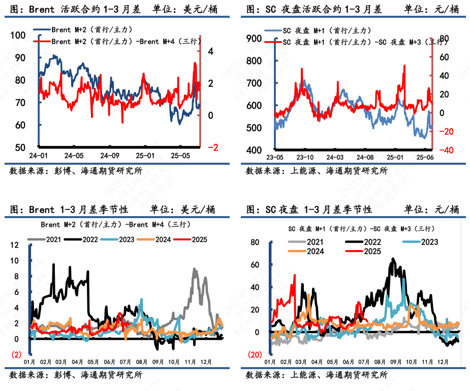 2)套利:①估值:7月4日凌晨2:30,Brent 2509盤面價為68.74美元/桶,SC 2510盤面價為502.1元/桶,測算SC 2510盤面理論價為510.1元/桶,當天盤面估值偏離程度-1.57%。從7天移動平均估值值中,以【-5%,0】為正常區間來看,目前仍處於合理估值範圍內。②利潤:測算SC2510盤面到岸利潤-8.01元/桶,摺合-1.12美元/桶。③價差:SC2510-Brent2509盤面差為1.35美元/桶,理論差2.47美元/桶,盤面價差低於理論價差。(注:本周Brent首行為2509;SC首行為2510;其中M代表時下7月)