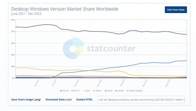 圖源Statcounter官網Windows11自2021年上市以來,到2022年12月僅佔據了不到10%的市場份額。自那時起,Windows11的市場份額一直緩慢而穩定地增長。2023年12月,Windows11的市場份額為26.54%