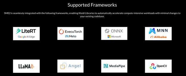 重要的是,安卓已經準備好支持 SME2。SME2 在 Google 的 XNNPACK 庫中啓用,並支持 llama.cpp、阿里巴巴的 MNN 和微軟的 ONNX 等框架。