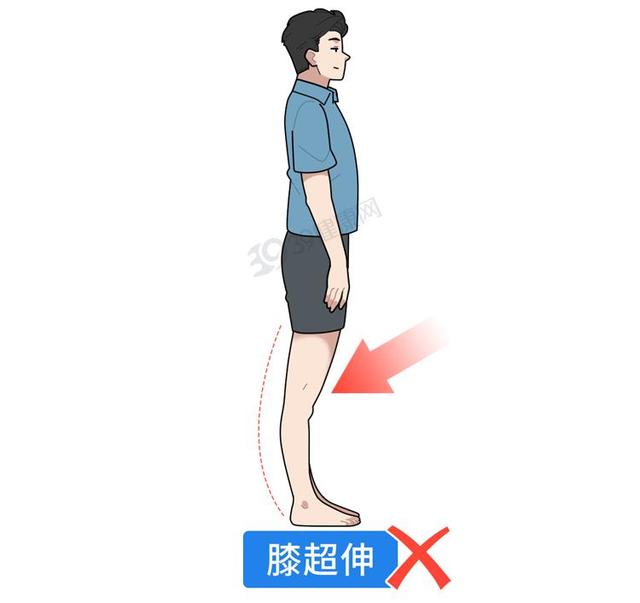 這種膝蓋過度後頂的站姿會讓關節承受異常壓力,加速磨損與老化。同時,由於重心前移,穩定性變差,摔倒受傷的風險也增加了。