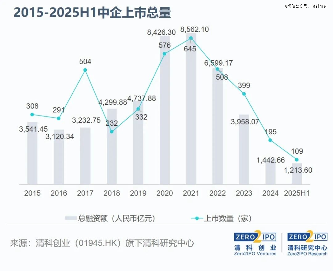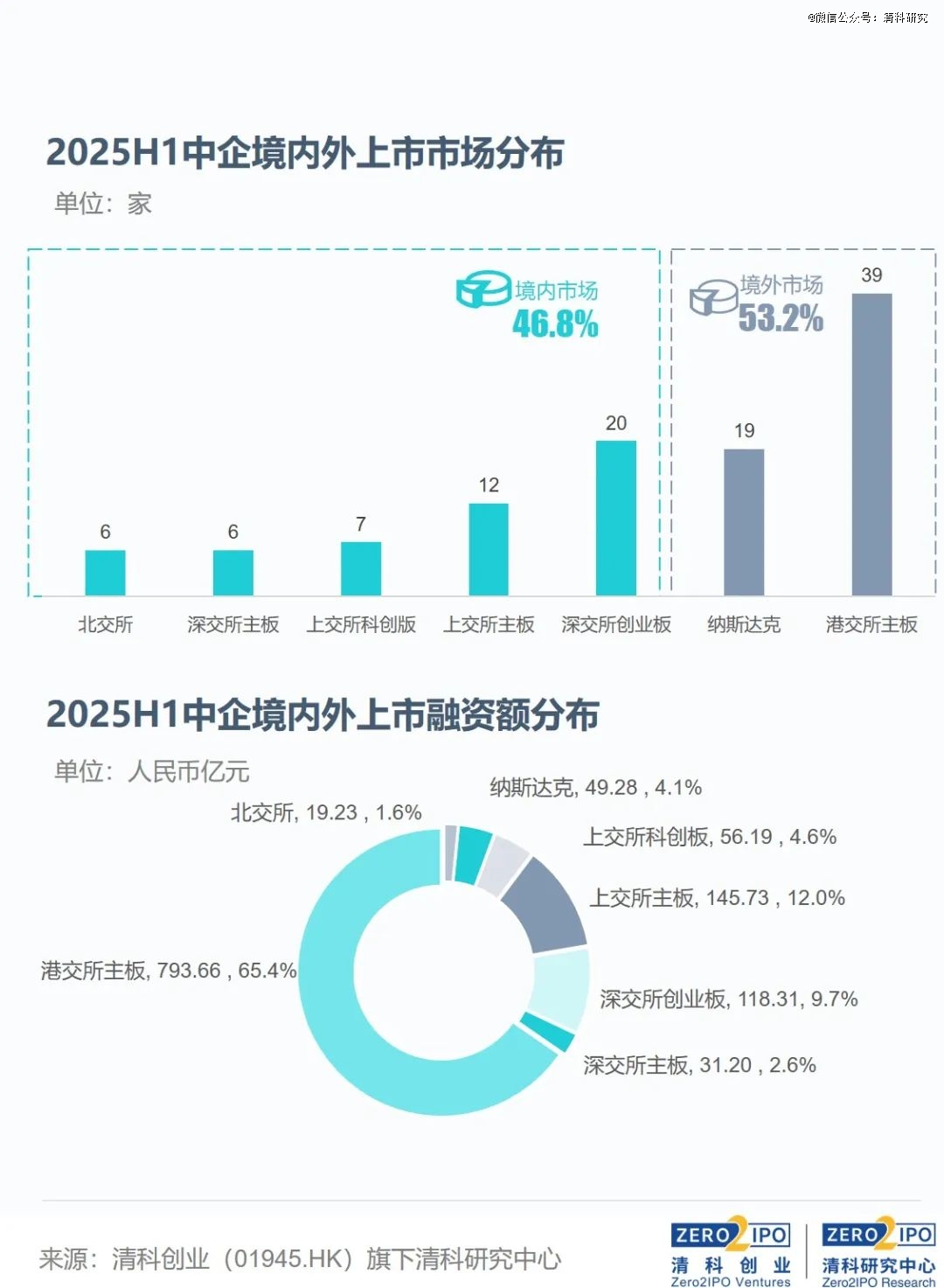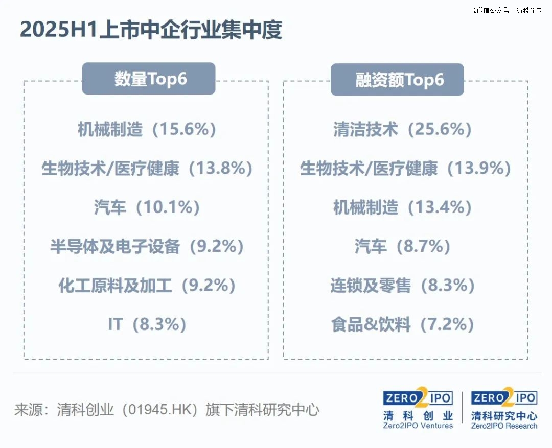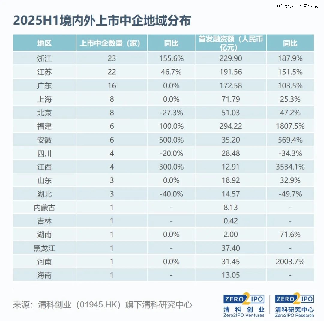 2025年上半年,中企IPO數量同比回升。根據清科創業(01945.HK)旗下清科研究中心統計,2025年上半年中企境內外上市109家【1】,同比上升32.9%、環比下降3.5%;首發孖展額約合人民幣1213.60億元【2】,同比上升158.7%、環比上升24.7%。分市場來看,2025年上半年A股共有51家企業上市,同比上升15.9%、環比下降8.9%;境外市場共58家中企上市,同比上升52.6%、環比上升1.8%。地域方面,浙江上市企業數量居首位,福建孖展規模*。行業方面,機械製造行業表現相對穩健。