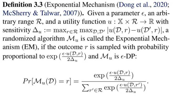 首先我們先聲明:下面所有的操作都需要考慮隱私保護,我們採用的是差分隱私(Differential Privacy, DP),並通過指數機制來實現 DP,其中指數機制定義為: