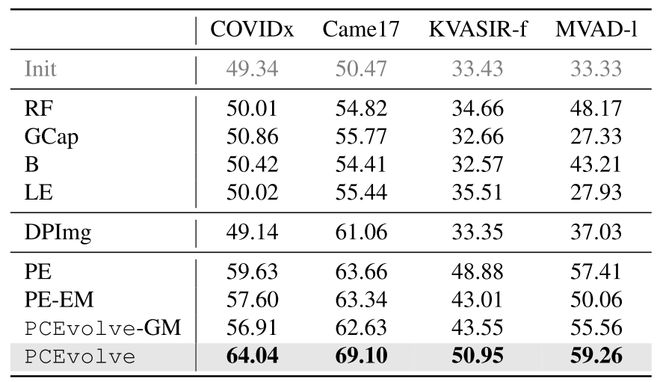 我們評估了 PCEvolve 在COVIDx(COVID-19 胸部 X 線圖像)、Came17(乳腺癌轉移的腫瘤組織切片)、KVASIR-f(用於胃腸道異常檢測的內鏡圖像)、MVAD-l(用於異常檢測的皮革表面)上的表現,這裏大模型方面我們只需提供 API 即可。