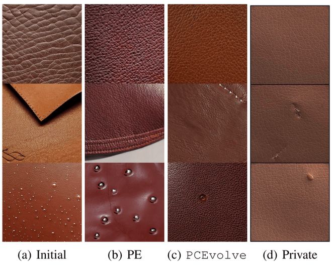 下圖是我們採樣的皮革表面數據,這三行分別代表正常皮革、有切割缺陷的皮革、有膠水殘留缺陷的皮革。「Initial」表示大模型 API 合成的圖像(進化之前);「Private」表示垂域場景真實採集的隱私皮革表面數據。