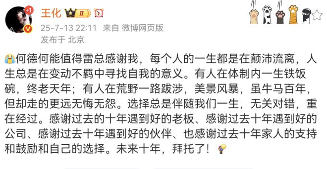 7月13日,雷軍轉發了王化的文章並感謝其十年的辛苦工作和貢獻,「時間過得好快,轉眼十年了,謝謝這十年辛苦的工作和貢獻」。
