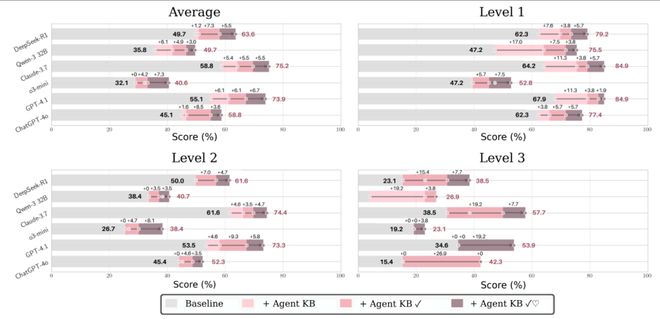 研究團隊還測試了六個主流 LLMs 在 Agent KB 增強後的性能表現。從 DeepSeek-R1 的穩步改進到 Claude-3.7 的顯著飛躍,從 GPT-4o 的均衡提升到 o3-mini 的大幅增長,所有測試模型都顯示出一致的改進趨勢。這種跨模型、跨難度級別的普遍性改進有力證明了 Agent KB 方法的普適性和可靠性。