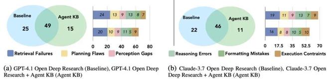 對於 GPT-4.1,在總計 89 個錯誤案例中,49 個錯誤在基線和 Agent KB 配置中均出現,表明這些是模型固有的難以克服的限制。關鍵的改進體現在 Agent KB 成功糾正了 25 個基線特有錯誤,同時僅引入 15 個新錯誤,實現淨減少 10 個錯誤實例的積極效果。Claude-3.7 的表現模式相似但更為出色,在總計 79 個錯誤中,糾正了 22 個基線錯誤,引入 11 個新錯誤,淨改進達 11 個實例。
