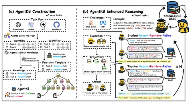 Agent KB 的深層架構精髓體現在其「Reason-Retrieve-Refine」步驟設計上,該方案巧妙地將層級化的經驗存儲與智能檢索機制相結合。整個框架圍繞兩個核心階段展開:Agent KB 知識構建階段和Agent KB 增強的推理階段。