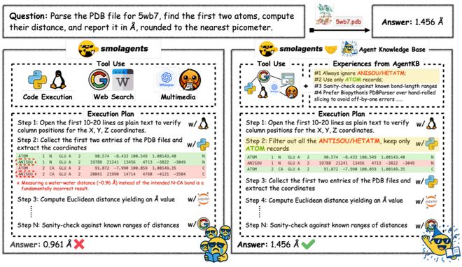 在傳統流程中,智能體會盲目讀取前兩行 ATOM/HETATM/ANISOU 記錄,經常誤選溶劑記錄,導致計算出錯誤的 O-H 距離(0.961 Å)。而 Agent KB 增強的 agent 則能夠應用經驗驅動的規則:智能過濾 ANISOU/HETATM 記錄,專注於真正的 ATOM 條目,並通過 N-CA 鍵長範圍的合理性檢查進行驗證,最終精準提取骨架 N-CA 原子對,報告出正確的 1.456 Å 距離。