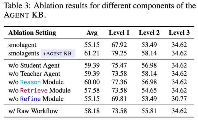 為了全面驗證 Agent KB 各個組件的獨立貢獻,研究團隊設計了系統性的消融實驗。Table 3 的詳細數據揭示了每個關鍵模塊對整體性能的影響程度。