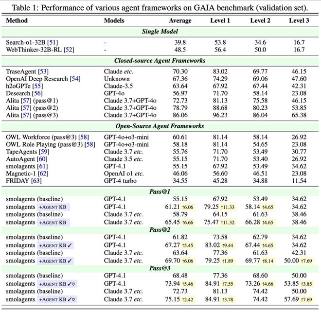 在 GAIA 基準測試中,Agent KB 取得了令人矚目的成果。由於 Agent KB 的研究團隊的初衷並不是為了提出一個更新的、更復雜的多智能體框架。所以他們選擇了相對十分簡單甚至結果不是那麼理想的 smolagents作為基礎智能體框架進行測試,這樣能夠更清晰地展現經驗共享機制本身的效果,而非複雜框架帶來的性能增益。
