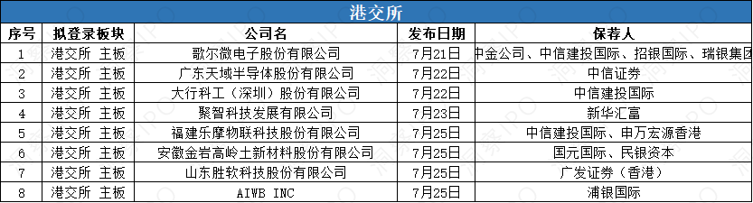 7月21日-7月27日,港交所有8家公司遞交主板上市申請。