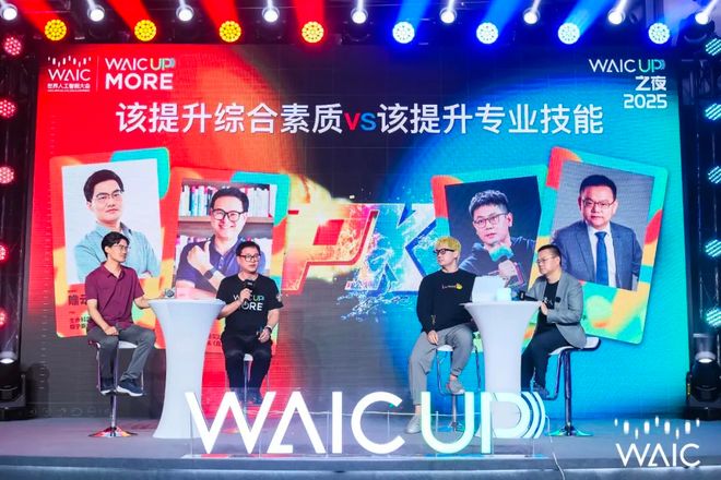 在大會期間,WAIC UP!之夜讓人們看到了AI的另一面:燈光、音樂、對話與碰杯,學者、藝術家、投資人、普通觀衆坐在一起聊未來。沒有PPT、沒有公式,只有「技術如何讓我們更像人類」的自由探討。辯論環節中,臺下的發光手環分成紅藍兩色,映照出思想的光譜;五位跨界嘉賓用脫口秀的方式,聊出了AI的溫度與邊界。