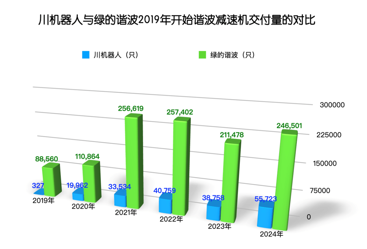 值得一提的是,川機器人諧波減速機出貨量佔行業龍頭綠的諧波減速機出貨量的比例也在不斷上升。2024年川機器人諧波減速機出貨量已經到了綠的諧波減速機出貨量的22.61%,接近四分之一。基於公司過往的成績和當前訂單,有消息人士透露,川機器人今年的目標是做到綠的諧波減速機出貨量的三分之一左右。
