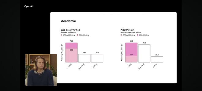 OpenAI 團隊上臺介紹 GPT-5 模型,表示 GPT-5 已經在包括 Swe Bench 在內的幾個基準上設定了一個新的水平,GPT-5 的關注點的關鍵領域是提高可靠性並準確地說明事實。IT之家附上 GPT-5 跑分如下: