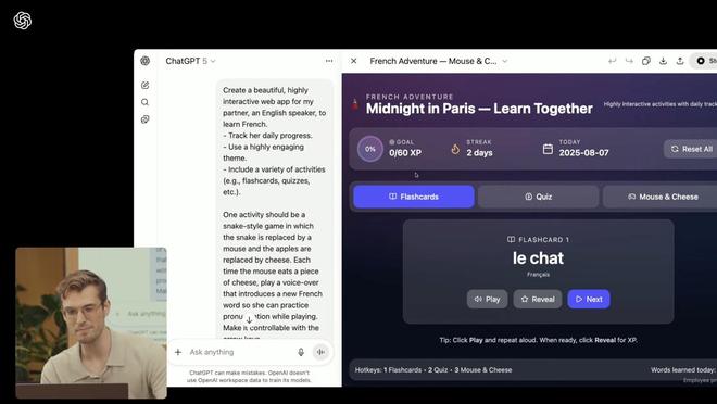 在 OpenAI 的編程演示中,GPT-5 表現良好,幾分鐘內輸出了超過 200 行代碼,創建了一個具有許多視覺元素甚至音頻元素的網站,設計場景是幫助伴侶用戶學習法語。