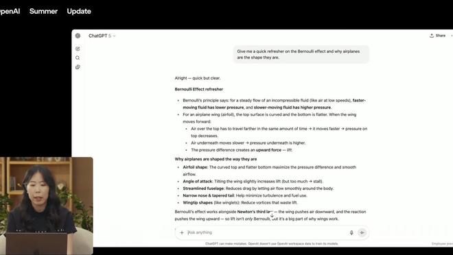 在直播中展示的第一個演示,是要求模型解釋 Bernoulli 效果,GPT-5 模型的響應速度很快。後續措施要求 GPT-5 創建視覺效果,OpenAI 解釋說,響應需要更長的時間。