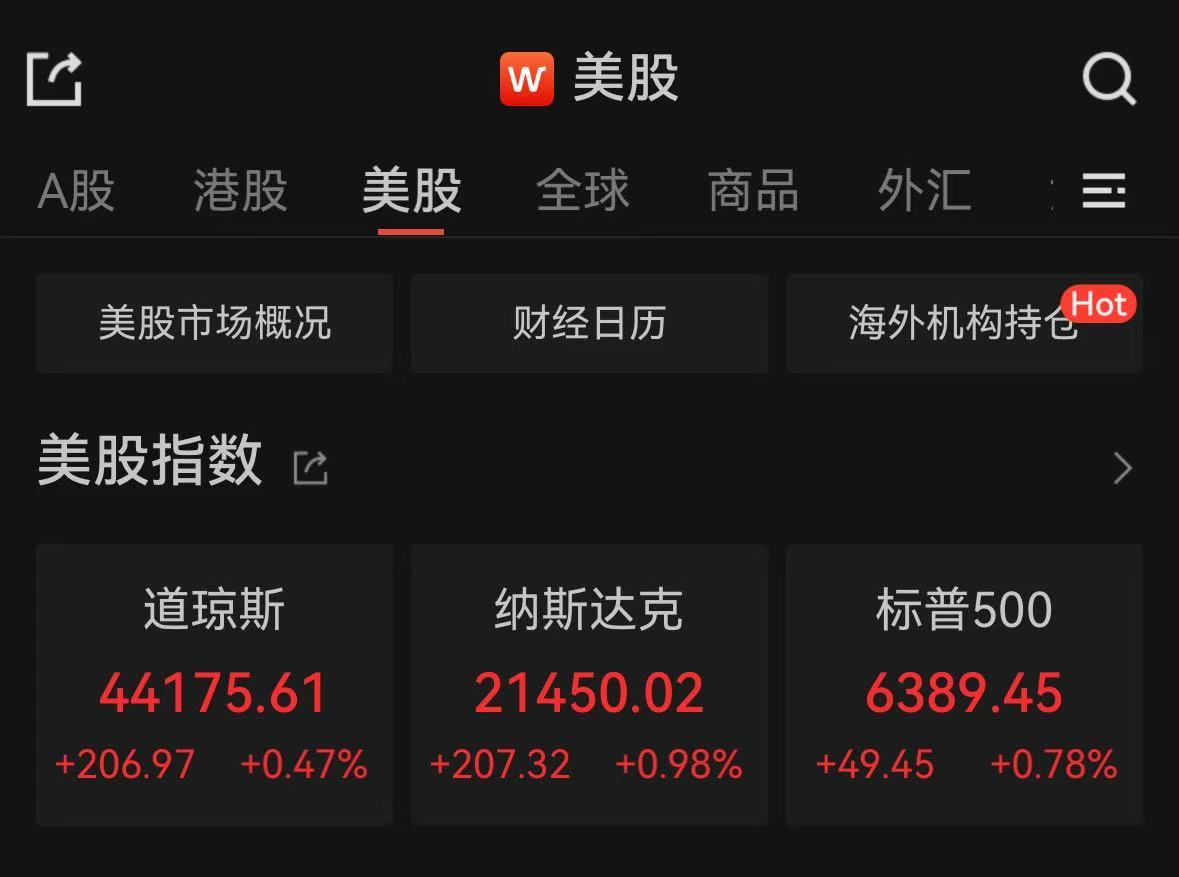 截至收盤,道指漲206.97點,漲幅為0.47%,報44175.61點;納指漲207.32點,漲幅為0.98%,報21450.02點;標普500指數漲49.45點,漲幅為0.78%,報6389.45點。