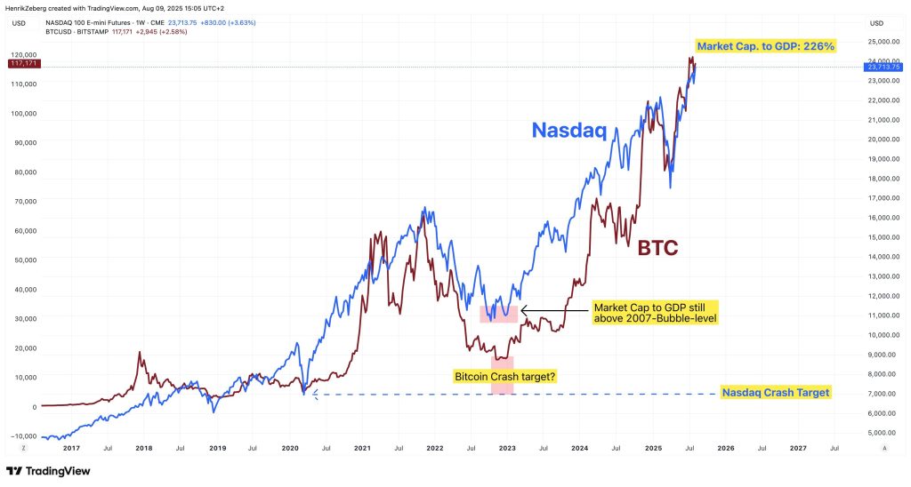 經濟學家亨裏克·澤伯格(Henrik Zeberg)在最近的一份分析中,對比特幣(BTC)的未來表達了擔憂,稱其為「一種高度風險資產」,而非獨特的投資機會。澤伯格指出,比特幣的價格波動與納斯達克指數走勢高度相關,暗示兩者都是他所稱的「科技泡沫2」(TechBubble2)這一正在形成的現象的一部分。
