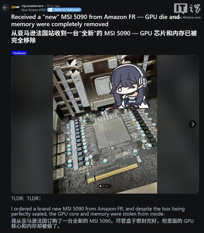 IT之家 8 月 10 日消息,據 Tom's Hardware 報道,近日一位法國消費者在 Reddit 的 PCMasterRace 論壇上分享了自己在亞馬遜法國購買 MSI RTX 5090 顯卡的不幸經歷。該用戶在 2024 年 7 月直接從亞馬遜法國訂購了一張 MSI RTX 5090 顯卡,然而在經過一年多的等待後,收到的顯卡卻是一個無法正常工作的「殘次品」。