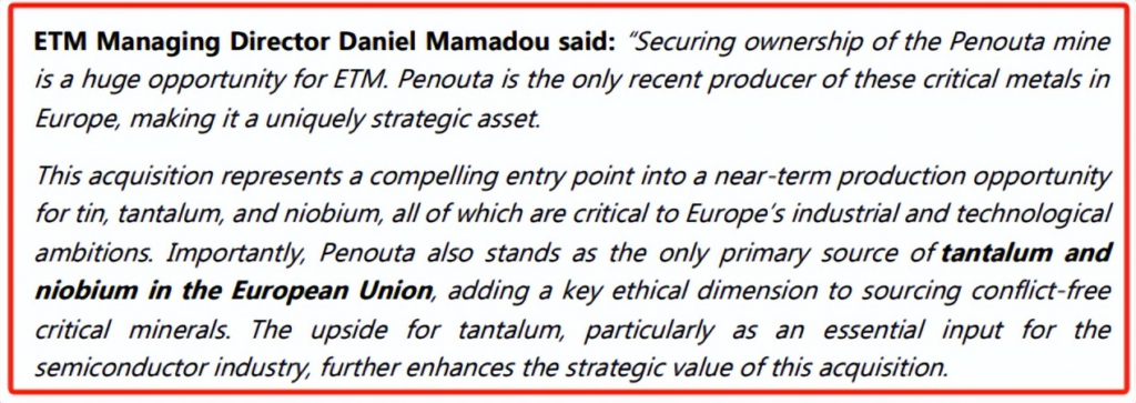 上週ETM曾宣佈將收購西班牙已投產的Penouta錫鉭鈮礦。ETM董事總經理Daniel Mamadou指出該礦是歐盟唯一的鉭、鈮主要來源,使之成為獨特的戰略資產。