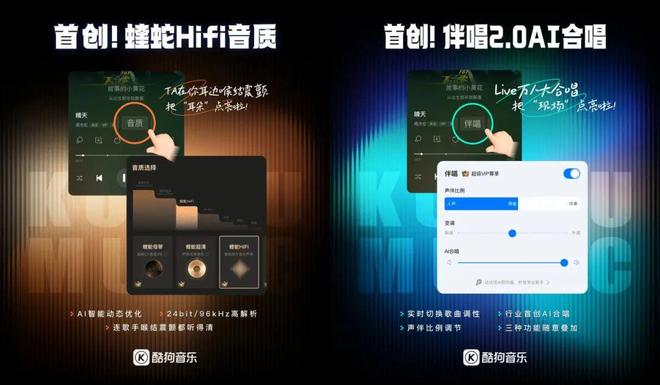 酷狗音樂近期上線的蝰蛇HiFi音質,路徑則更加「硬核」——基於AI聲場優化與高解析標準等技術力,使用戶身臨其境地感受高保真音樂的純粹質感。此外,AI亦被引入到合唱場景,藉助多音色生成技術模擬多人合唱效果,實現用戶體驗的躍遷。