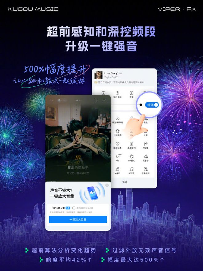 比如,當下手機揚聲器性能不斷進化,但在實際外放場景中,音量一旦調高,便可能出現失真與頻段缺失等問題,導致聽感滑落。對此,酷狗音樂推出「一鍵強音2.0」功能,在避免破音的前提下,將外放響度推至極限,同時保持音質的清晰與飽滿。