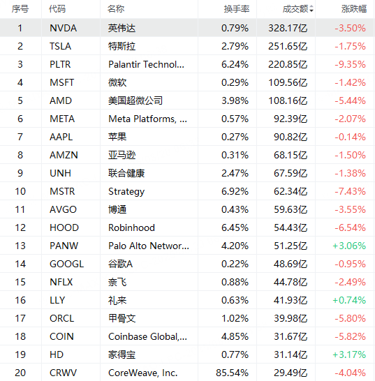 第3名Palantir收跌9.35%,成為今日表現最差的標普500指數成份股,成交220.85億美元。儘管該股受到散戶追捧,但多家機構警告稱其股價過於昂貴,且該股前瞻市盈率高達245倍(英偉達僅為35倍),已令部分分析師感到不安。