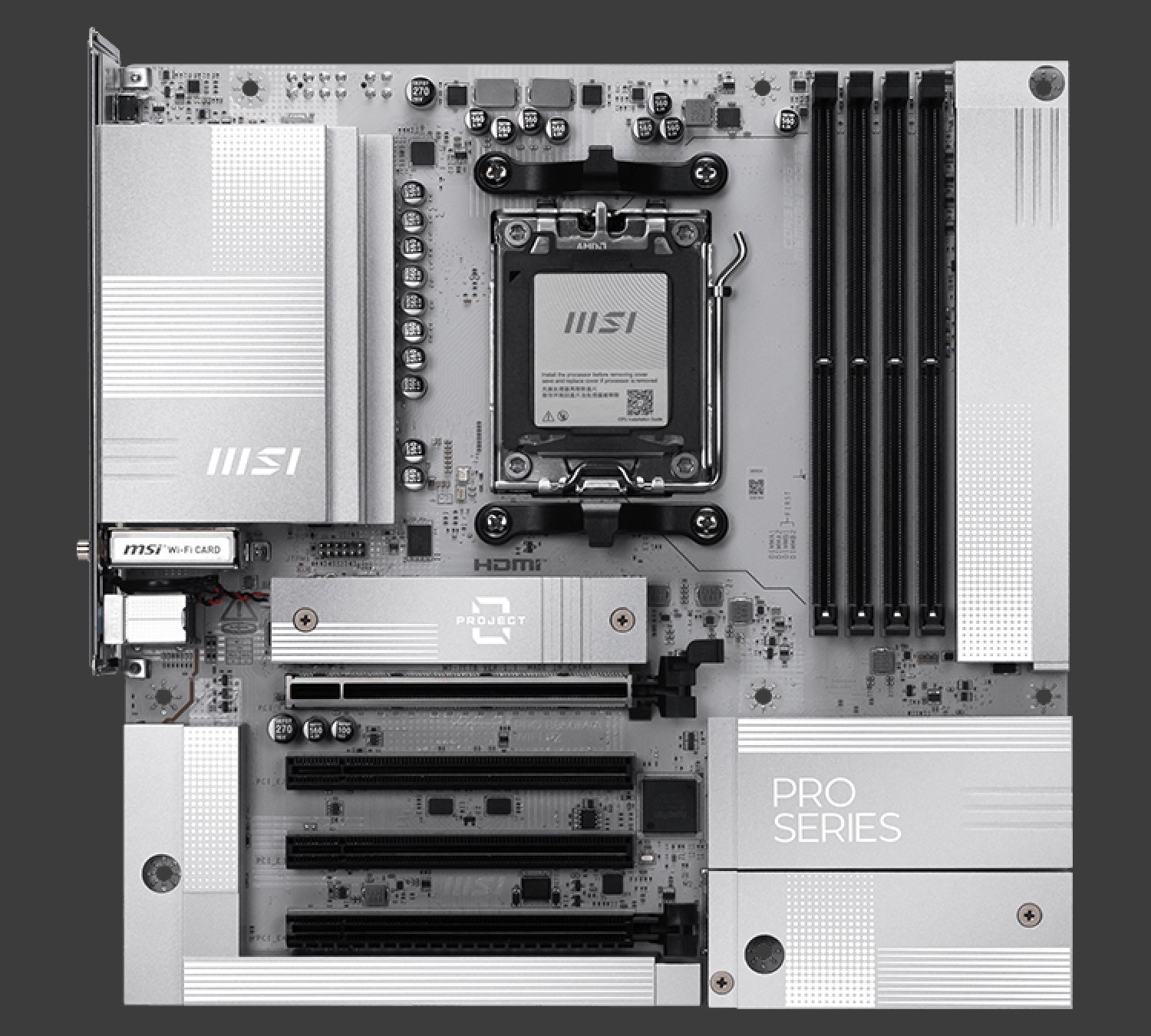 PRO B850M-A WIFI PZ 採用標準 M-ATX 外形規格,整體爲銀白配色,內存插槽、PCIe 插槽、處理器散熱器固定框架等仍爲黑色。其 基於 6 層 2 盎司銅 PCB,配備 8 (60A SPS DrMOS)+2+1 相供電,背部擁有 4+8-Pin 的 EPS CPU 供電接口。