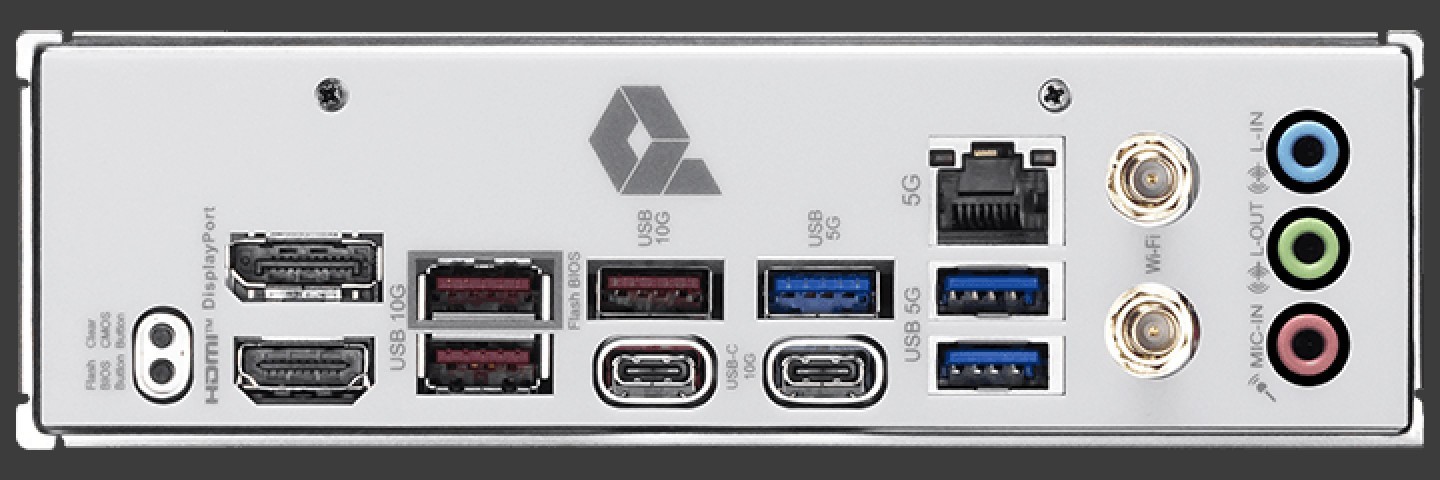 後置接口:1× HDMI 2.1 TMDS、1× DisplayPort 1.4、3× USB-A 10Gbps、2× USB-A 10Gbps、3× USB-A 5Gbps、1× 5GbE RJ45、一對 Wi-Fi 天線插孔、3× 音頻插孔。