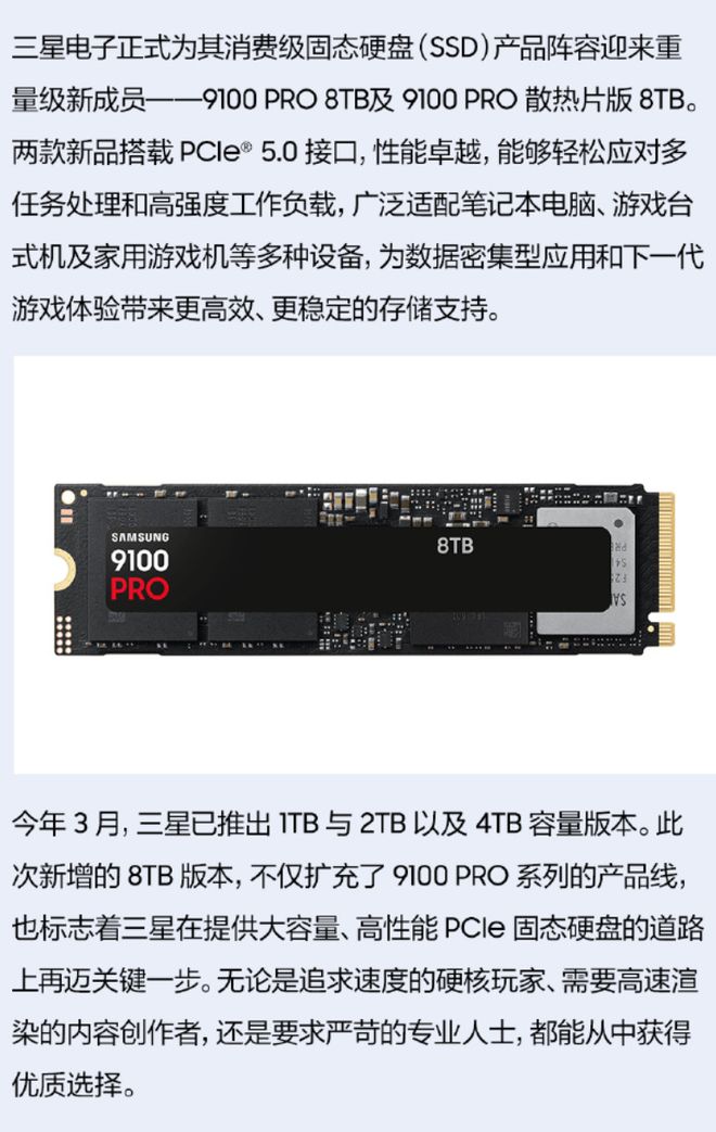 IT之家 8 月 20 日消息,三星今天爲 9100 PRO 固態硬盤新增了 8TB 版本,可選自帶散熱片 / 無散熱片版本,售價 999.99 美元(IT之家注:現匯率約合 7184 元人民幣)起。
