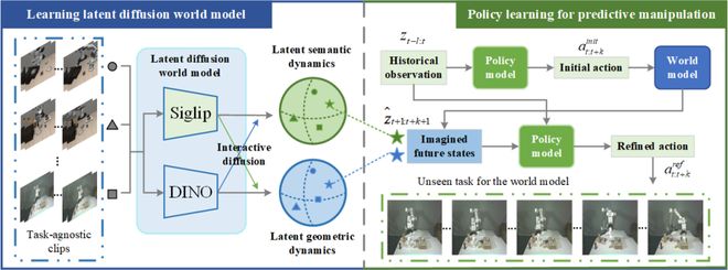 圖 1 :(左)通過任務無關的片段學習隱擴散世界模型;(右)通過世界模型的未來狀態預測來優化策略模型技術路線