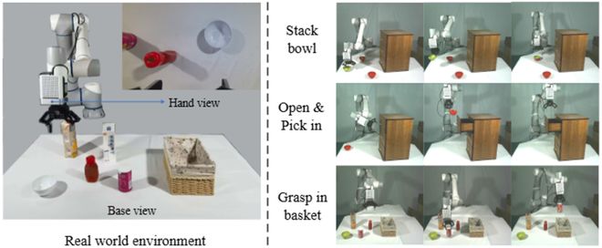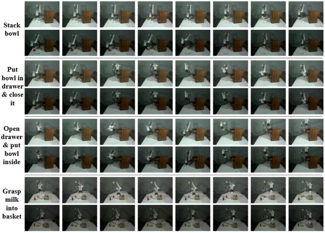 團隊也在真實場景中驗證了所提出框架的性能,具體操作任務包括「疊碗」、「開抽屜」、「關抽屜」以及「抓取物體放入籃子」等,如圖 6 所示。