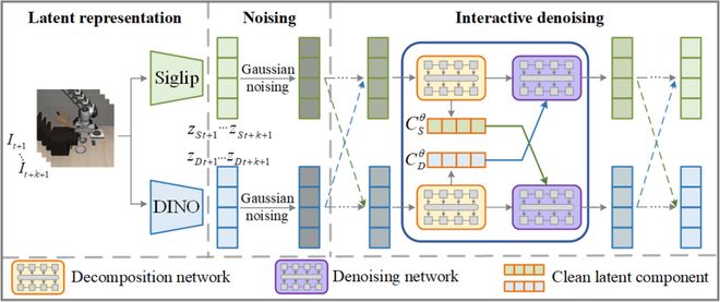 (a)隱空間表示:通過預訓練的視覺基礎模型對觀測圖像提取幾何表徵與語義表徵,其中幾何表徵利用 DINOv2 提取,而語義表徵則使用 Siglip 提取。