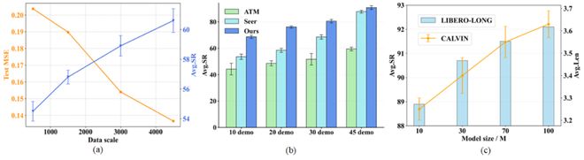 圖 4 : 可擴展性實驗為了驗證 LaDi-WM 的跨場景泛化能力,團隊在 LIBERO-LONG 上訓練世界模型,並直接應用於 CALVIN D-D 的策略學習中,實驗結果如表 3 所示。若是使用在 LIBERO-LONG 訓練的原始策略模型,直接應用到 CALVIN D-D 是不工作的(表第一行);而使用在 LIBERO-LONG 訓練的世界模型來引導 CALVIN 環境下的策略學習,則可以比在 CALVIN 環境訓練的原始策略的性能高 0.61(表第三行)。這表明,世界模型的泛化能力要優於策略模型的泛化能力。