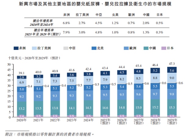 據弗若斯特沙利文預測,未來幾年新興市場的嬰兒紙尿褲、嬰兒拉拉褲及衛生巾行業將保持穩定增長態勢。其中,非洲市場最具潛力,預計將從2025年的41億美元增至2029年的56億美元,年均複合增長率達7.9%;拉丁美洲市場預計從79億美元增長至90億美元,年均增長3%;中亞市場雖規模較小,但也將從5億美元增至6億美元,保持4.8%的年均增速。