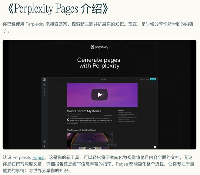 Discover上的文章不是隨機扒來的,而是結合PerplexityPages生成——一個幫助用戶將搜索結果整理為結構化、視覺化文章的工具。